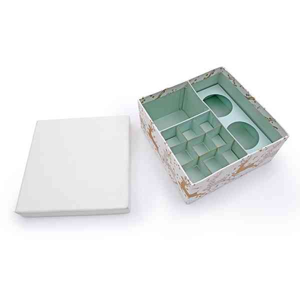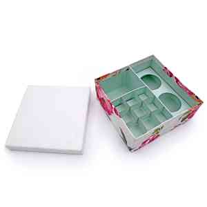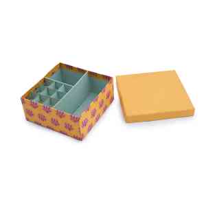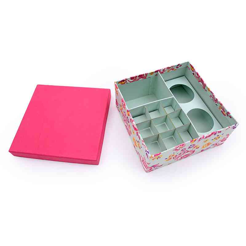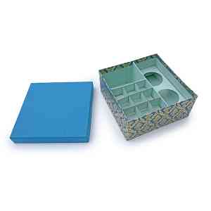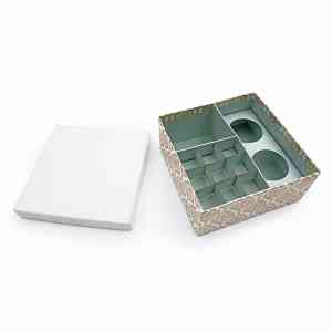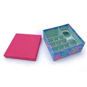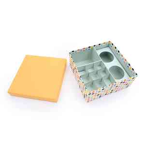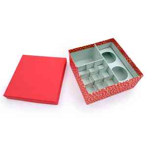 ** It consists of cavities each of size(L'B*H)1.5*1.5*1.5 inch. Jar volume 190 ml jar size 3.25 inch height 2.5 inch diameter will fit. All cavities in the box are removable and are made of duplex sheet. The empty compartment is of size 4.25 inch x 3.25 inch x 3.5 inch (L"B.H). **